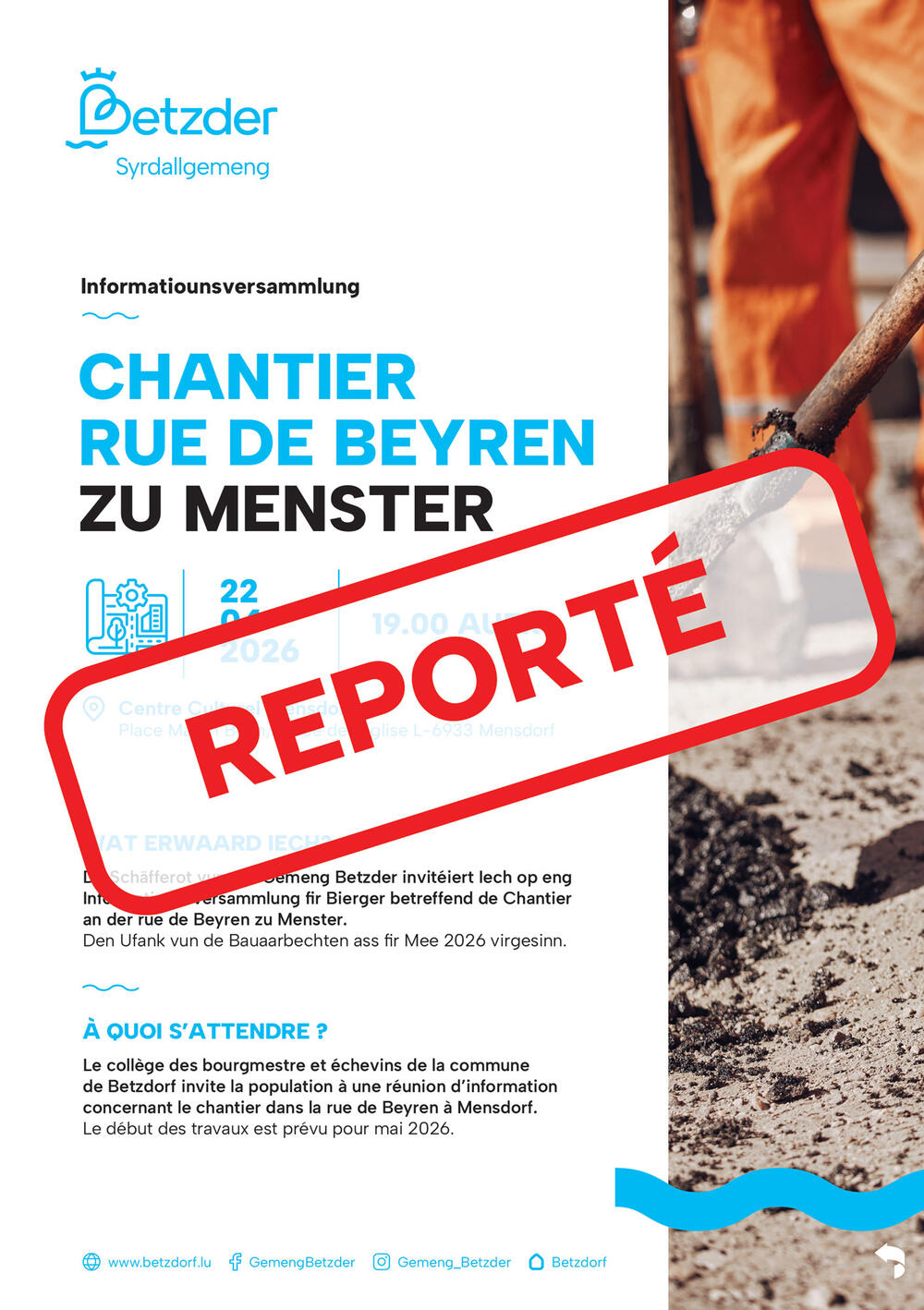 🇱🇺 D'Informatiounsversammlung iwwert de Chantier zu Menster, déi den 22. Abrëll virgesi war, gëtt op e spéideren Zäitpunkt verluet.